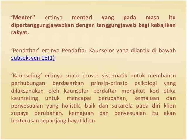 Akta kaunselor 1998 akta 580 from cdn.slidesharecdn.com Akta lembaga minyak sawit malaysia 1998. Akta lembaga minyak sawit malaysia 1998. Akta kaunselor 1998 akta 580. 3 akta kaunselor 1998 (akta 580) suatu akta untuk mengadakan peruntukan bagi pendaftaran dan amalan kaunselor dan bagi perkara perkara yang berkaitan dengannya. Akta tersebut telah mewajibkan pendaftaran ke atas setiap kaunselor. 21,435 likes · 8,600 talking about this. (siti zalikhah 2002) dengan ini, etika kaunselor mula digariskan untuk memandu kaunselor dan sesi kaunseling yang akan dijalankan. & counsellors act (act ) and regulations lembaga kaunselor malaysia an introduction to counseling.