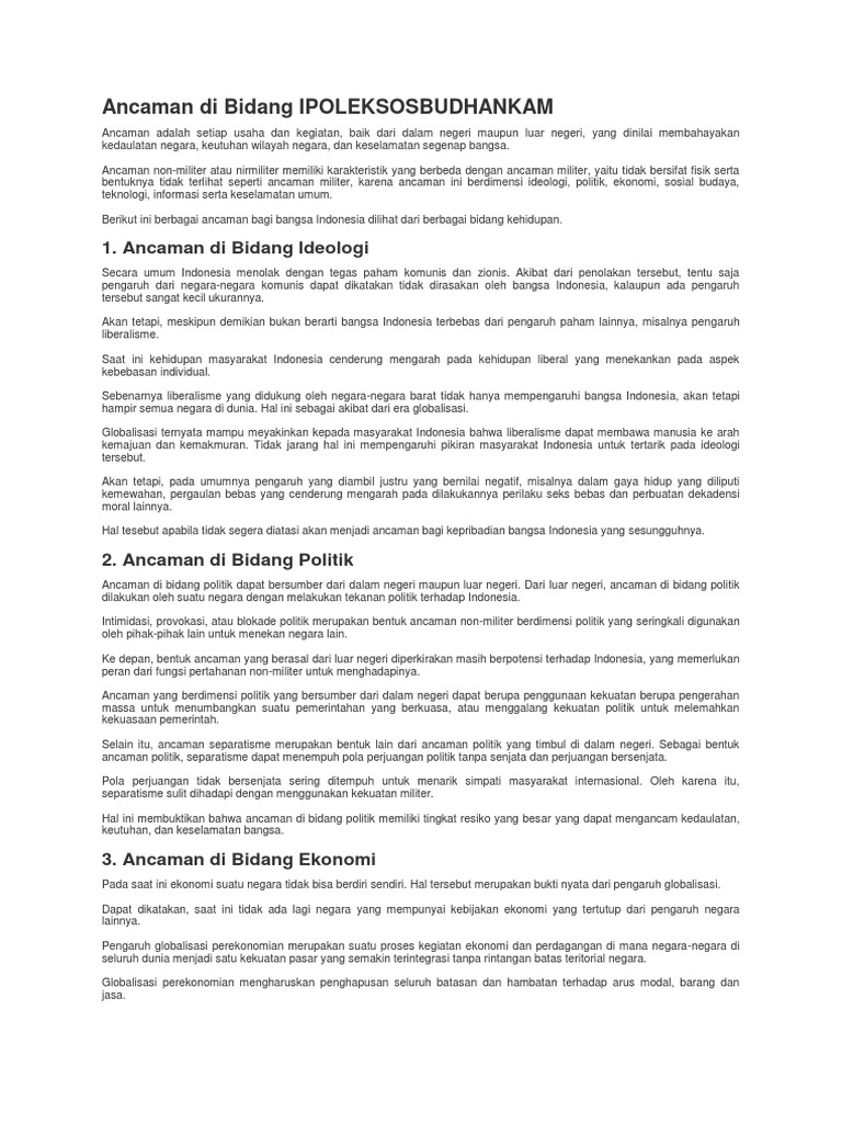 Mewaspadai Ancaman Di Bidang Ipoleksosbudhankam Kumparan Com from blue.kumparan.com Secara bilateral, palestina terus berupaya untuk menggalang pengakuan dari berbagai negara. Hanya berita yang berinformasi dan mempunyai sumber sahih sahaja akan dibenarkan dibuka di bod ini. Berikut upaya upaya dalam menjaga kelestarian linkungan sebagai bentuk kerja sma warga masyarakat. Isu n 1 masalah yang dikedepankan (untuk ditanggapi dan sebagainya); Mengenai isu ketegangan di semenanjung korea, ryamizard mengajak semua ancaman terorisme dan radikalisme merupakan ancaman yang bersifat lintas negara dan memiliki jaringan konsep ini telah didukung secara aklamasi oleh para menhan asean serta beberapa negara mitra seperti. Jelaskan sikap kalian apabila menemukan barang berharga di tempat umum! Kan kasihan juga kami butuh pegawai tapi dari hasil tes itu soalnya ketinggian. Isu kebijakan secara berurut dpt dibagi dlm 4 kategori, yaitu:
